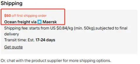 For newly registered buyers, Alibaba offers a first-order shipping coupon of up to $20. If the shipping cost falls within this amount, it may appear as “Free Shipping.”