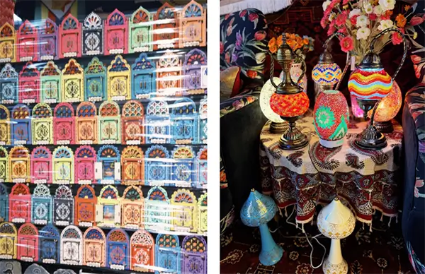 Persian-style tile décor, handmade Turkish ceramic bowls, metallic-finish tea sets, and brass serving bowls with gold-toned finish are widely seen across the market.