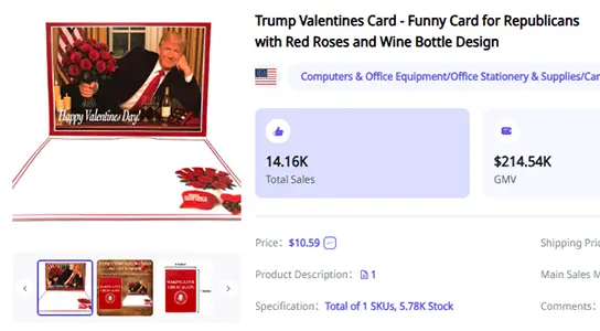 The product’s differentiation lies in the design using AI-generated imagery, which allows highly realistic visuals at very low cost, creating a humorous and highly shareable product. Similar Trump-themed greeting cards, including Father’s Day, Mother’s Day, and birthday editions, have also shown strong sales performance.