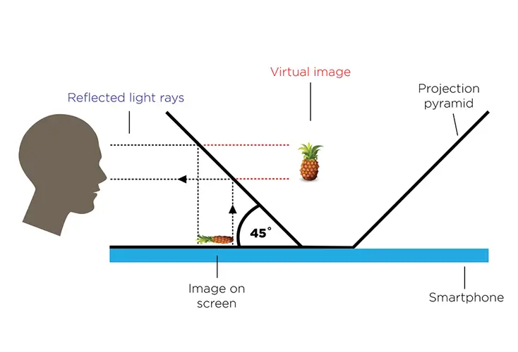 What this product does is dramatically simplify that system. By using a 45-degree angled transparent surface and a smartphone screen as the light source, it recreates a low-cost, desktop version of the same visual illusion.