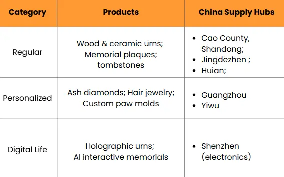 | Regular | Wood & ceramic urns; Memorial plaques; tombstones | Cao County, Shandong; Jingdezhen; Huian |